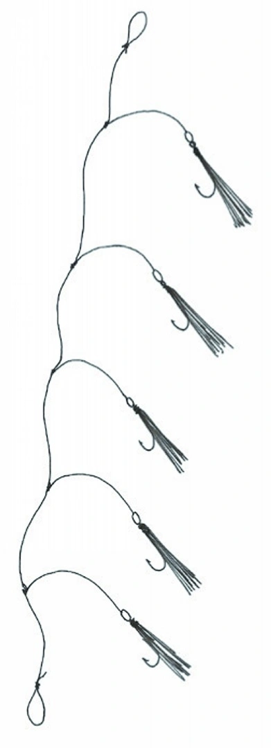 Paternoster rig voor het vissen op makreel. Deze paternoster heeft in totaal 5 haken en kan eenvoudig aan wartel en sleeplood worden bevestigd.