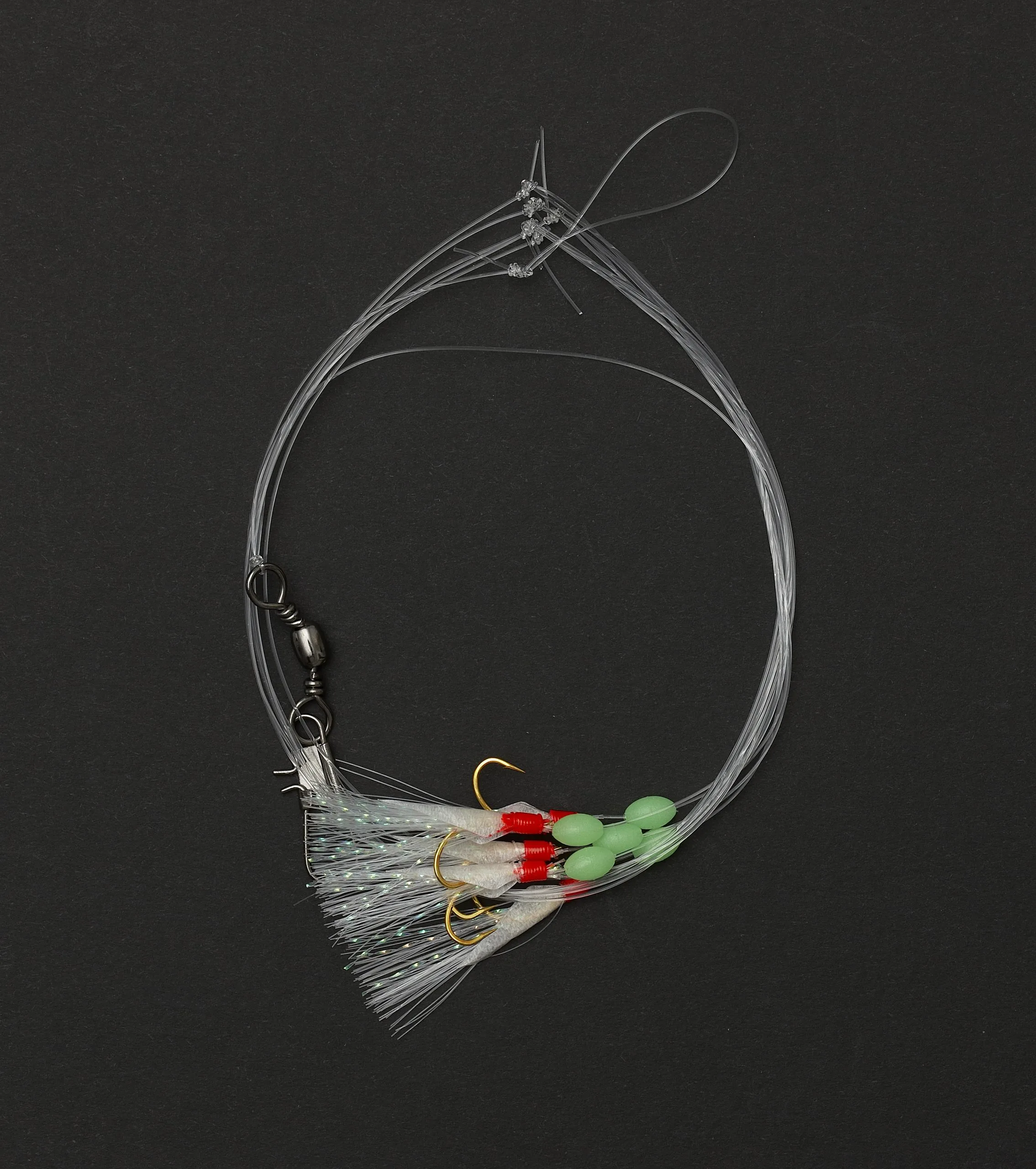 Stevige nylon onderlijnen voorzien van 5 prachtige flash feather! met UV Real Skin, Uiterst geschikt voor diverse visserijen op zee, waaronder het vissen op haring, makreel of zeebaars.