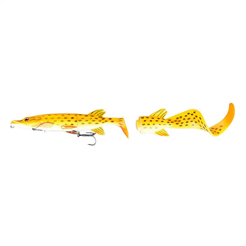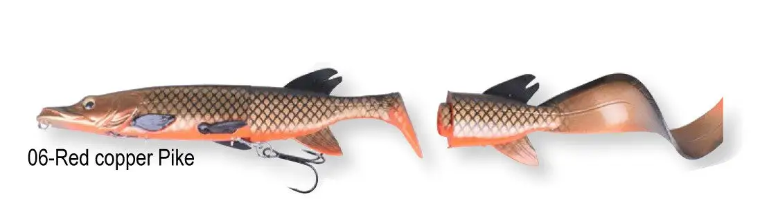 Super realistische snoek imitatie met 3D vorm. Met de schoepstaart krijgt het aas een mooie rollende beweging en een uitdagend ratelgeluid. Met de grote krulstaart kan je deze hybride bait heel langzaam binnenvissen en alsnog zorg deze staart voor een mooie actie. De krulstaart kan zowel naar boven als naar onder gemonteerd worden. Naar boven gericht dan loopt dit aas ondiep (de kop wordt naar boven gedrukt), naar benden gericht dan duikt dit aas wat dieper ( de kop wordt naar beneden gedrukt).