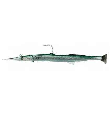 Based on a 3D scan of a real needlefish, we have created the perfect needlefish imitation! The lure not only looks like a needlefish, it acts like one! We equipped the lure with our Unique pulse tail that gives a very discreet vibration and tail action exactly like a real needlefish! The hollow metal alloy head has a line thru tube, so when rigged the lure slides up the mainline and away from the hooked fish, protecting the lure and ensuring the fish can not use the weight of the lure to throw the hooks. The PVC Body is secured to the head with a Cork screw, so the lure can handle high speed and brutal strikes. Each lure is supplied with a spare tail and Carbon49 wire rig with ST46 Trebles in PS finish.