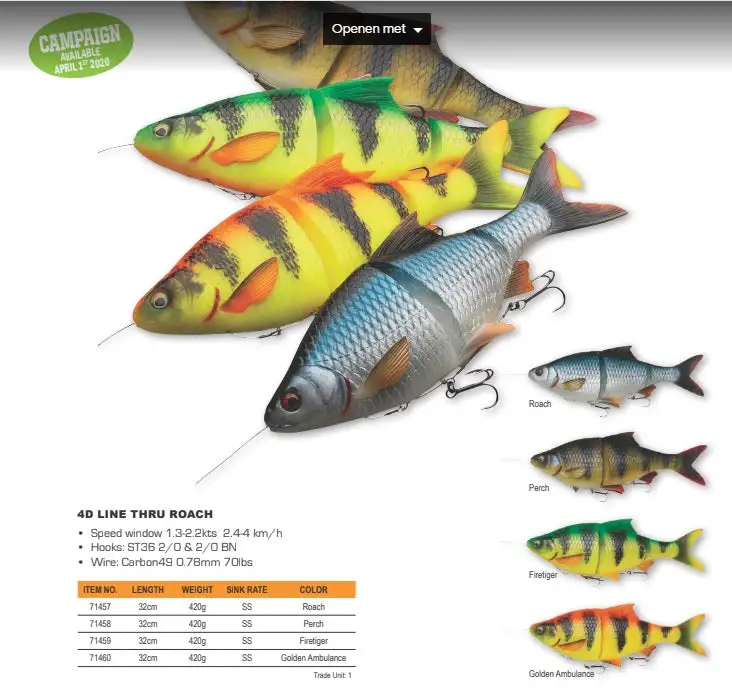 The Savage Gear 4D Roach series of lures are all based on a 3D scan of a real roach and will amaze you with their details, realism and incredible swimming actions. Quite simply, this is the pinnacle of roach imitation, that looks and swims exactly like the real thing. Our famous Line Thru system has been further developed, so the hook can swing freely outside the body on the broadest point of the body, ensuring great hook-up and even better landing rates. The new Little Line Thru modifier is a great innovation and the lure can easily be transformed to hold two treble hooks.