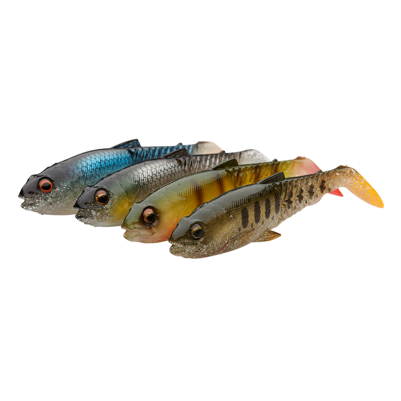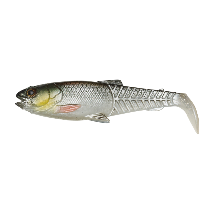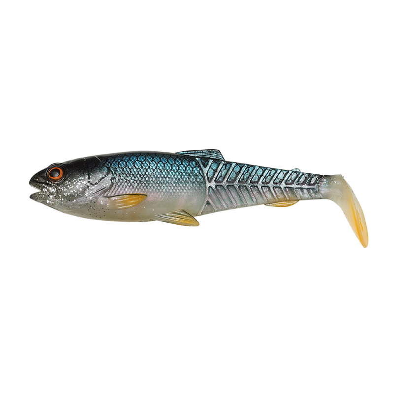Crafted and designed by legendary designer Mads Grosell. The lure profile is inspired by a baby trout smolt, with the classic Cannibal open mouth, a realistic big soft eye and a new unique tail bridge design, that enables the lure to swim amazingly life-like even at very slow speed. The lure swims equally well on retrieve and as on the drop and the tooling making and handcrafted details and painting set new standards for soft lure making! This paddle tail loose body lure will catch just about any predator fish out there!