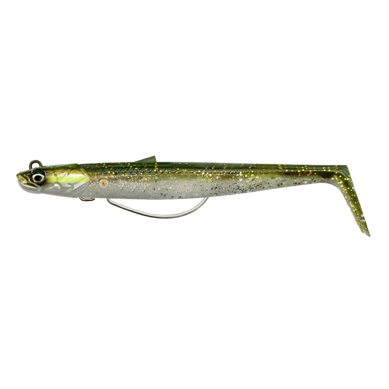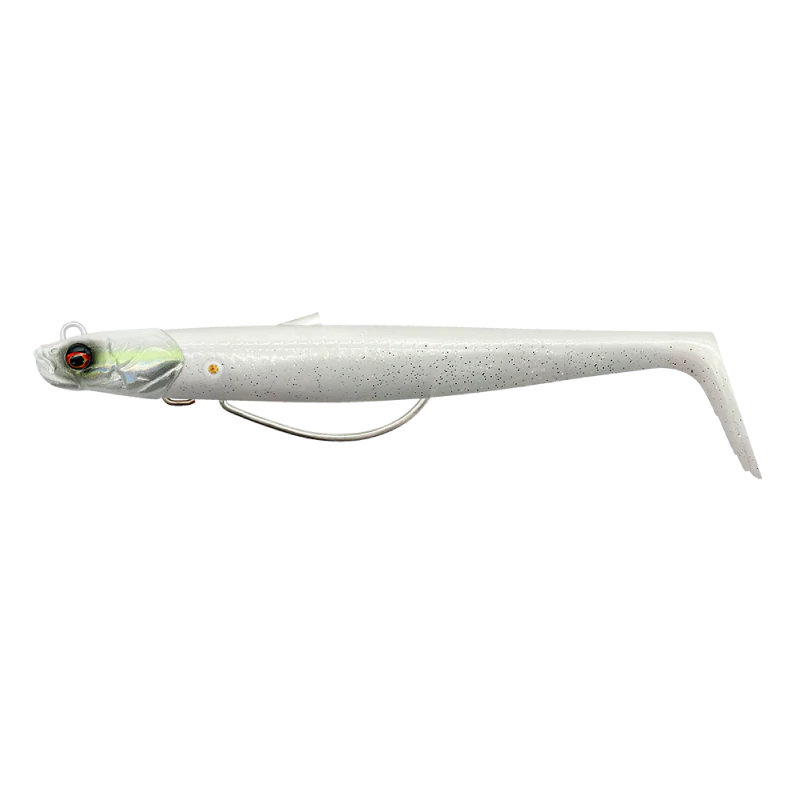 With a lively kicking action on both the drop and the retrieve, this super realistic sandeel imitation will fool even the wariest of predator fish. The unique jig head ensures a perfect rolling action and that the lure will come up on retrieve. The Pro Peg body holder makes it possible to peg the body to the head with a toothpick, creating a very simple and secure hold. The soft PVC body comes pre-rigged with an internal glass rattle that gives off a provoking sound to any nearby hunting fish. This weedless version of the lure features a strong click-on connection for the interchangeable EWG hook.
