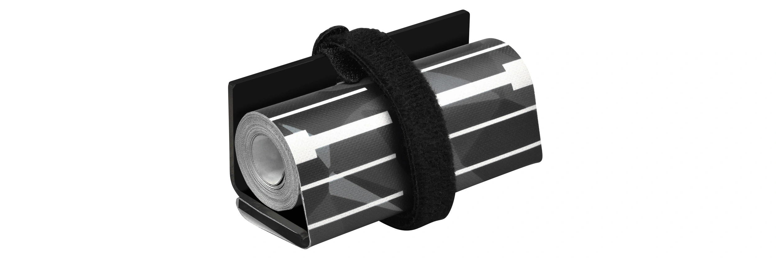 Een supercompact PVC meetlint. Uitgevoerd met Velcro-strip en opstaande L-rand.