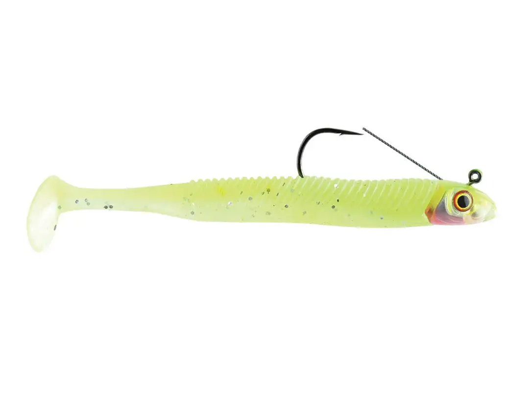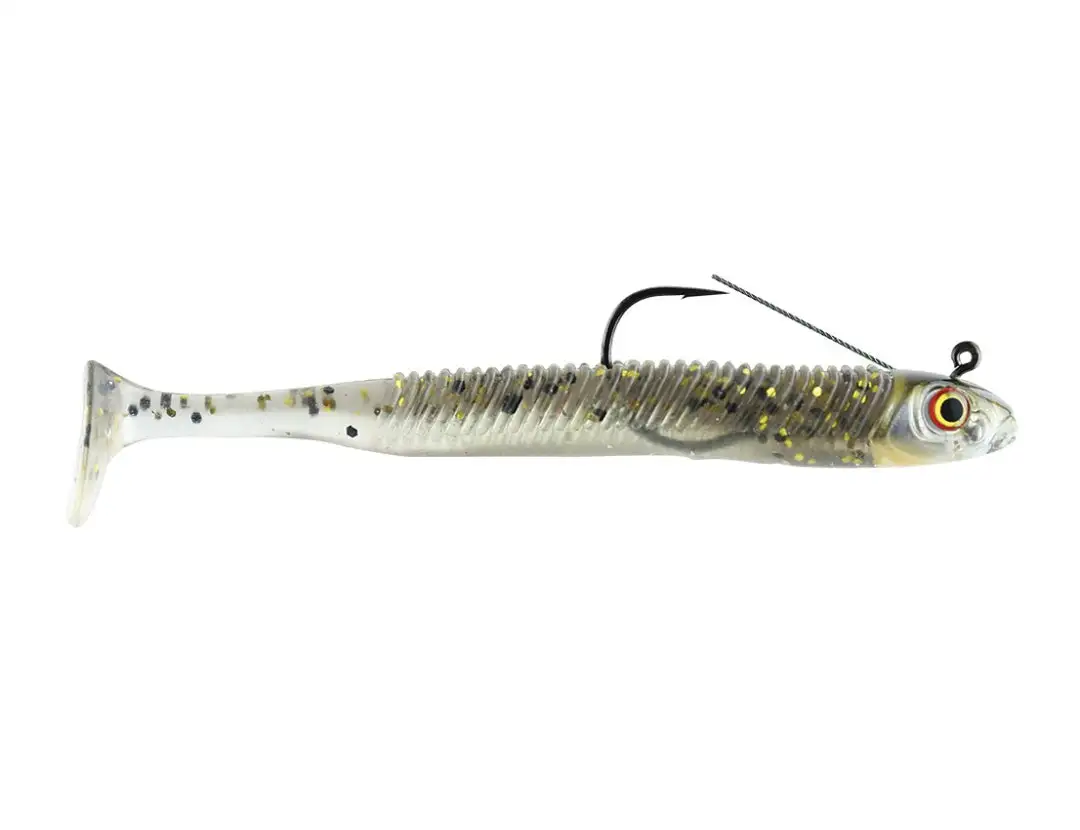 Designed to be fished anywhere, by anyone, of any skill level; the Weedless 360GT Searchbait from Storm is the ultimate confidence lure. With its big boot tail and supple PVC body design, the Weedless 360GT Searchbait kicks wildly and rolls side-to-side like a distressed minnow as it tries to escape. A body rolling scope of almost 180 degrees creates maximum flash during a standard retrieve. The soft body is matched to an ABS molded weedless jig head complete with internal rattle and VMC coastal black hook.