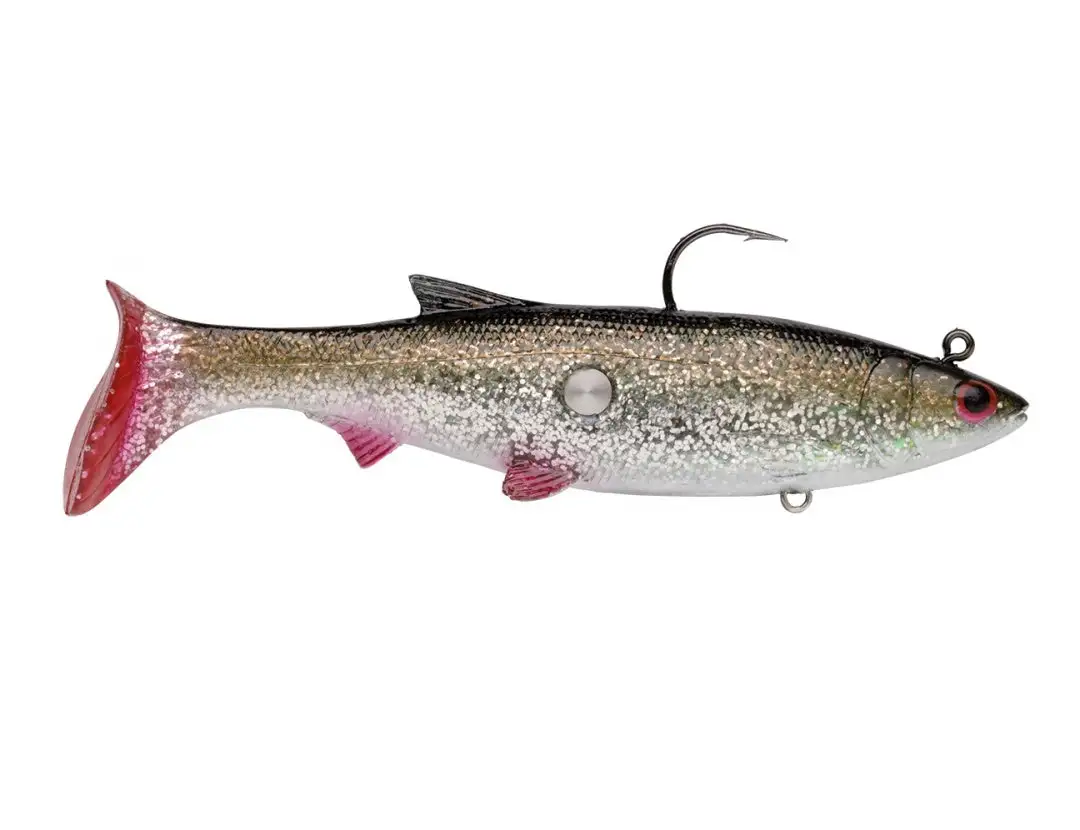Soft body meets hard metal. The life-like soft body of the Knock’r Minnow gives the lure a baitfish appearance while the through-body metal chamber with an internal stainless steel ball creates a loud clacking sound. The exposed metal discs at the ends of the chamber transmit the knockin’ sound directly to the water without dampening it. Large paddle tail for strong body roll with a kickin’ tail action.