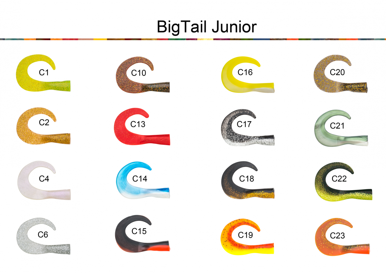 The BigTail Junior is a perfect tail for all types of gilde, jerk and tail baits. The wider and thinner tail works in any kind of speed with a rippling swimming action.