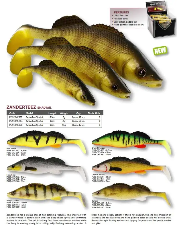ZanderTeez has a unique mix of fish-catching features. The shad tail with a slender wrist in combination with the body shape gives two swimming actions in one bait. The tail is kicking fast from one side to another while the body is moving slowly in a rolling belly-flashing swimming action. A super-hot and deadly action! If that’s not enough, the life-like imitation of a zander, the realistic eyes and hand painted color details will do the trick. Perfect for spin fishing and vertical jigging for predators like perch, zander and pike.